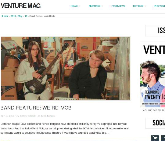Venture Magazine features Weird Mob Posted on May 16, 2013May 17, 2013 by Rebekah Tweed Venture Magazine nails the Weird Mob vibe in this feature, noting the “brilliantly nerdy” project is “what the 60′s interpretation of the post-millennial sci-fi scene would’ve sounded like”. Read the full piece here. // Weird Mob media page // Share this: Click to share on X (Opens in new window) X Click to share on Facebook (Opens in new window) Facebook Like Loading... Related