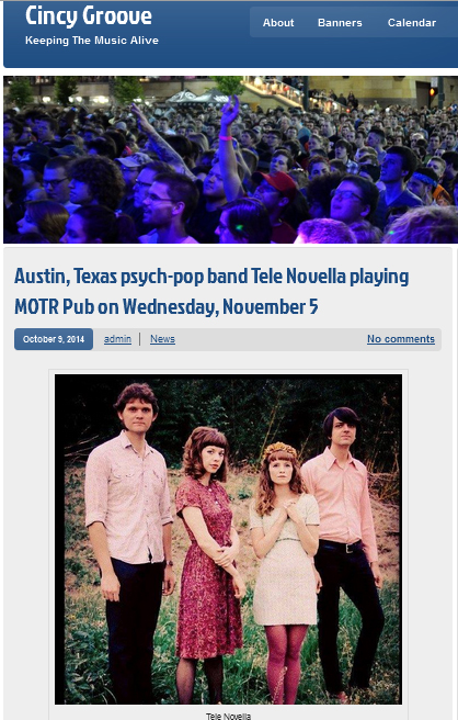 Cincy Groove previews Tele Novella Posted on October 25, 2014November 6, 2014 by Rebekah Tweed Cincy Groove previews Tele Novella‘s upcoming show at MOTR Pub. Share this: Click to share on X (Opens in new window) X Click to share on Facebook (Opens in new window) Facebook Like Loading... Related