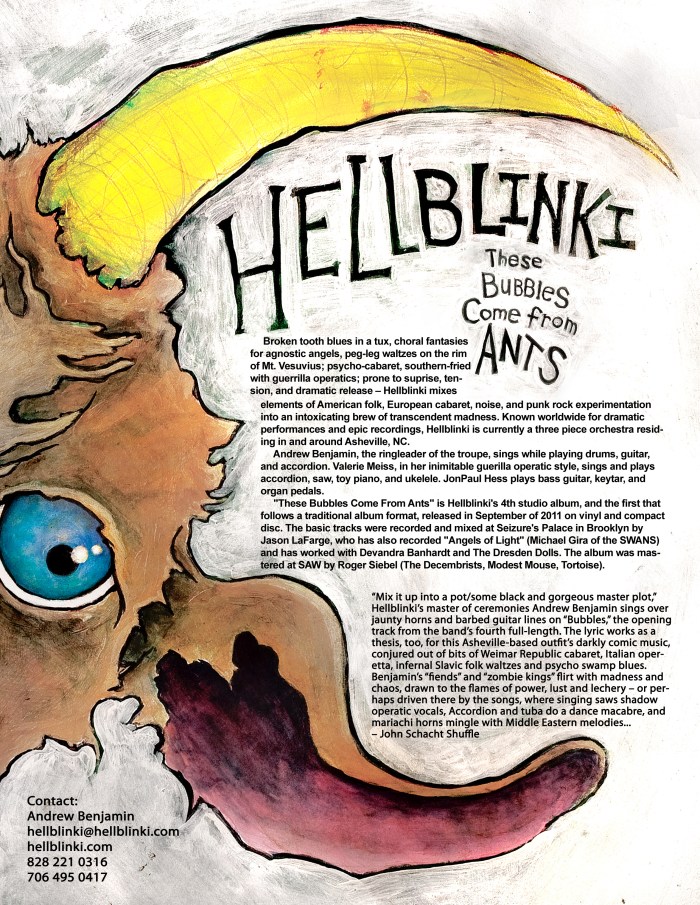 These Bubbles Come From Ants is Hellblinki’s 4th studio album, and the first that follows a traditional album format, released in September of 2011 on vinyl and compact disc. The basic tracks were recorded and mixed at Seizure’s Palace in Brooklyn by Jason LaFarge, who has also recorded “Angels of Light” (Michael Gira of the SWANS) and has worked with Devandra Banhardt and The Dresden Dolls. The albums was mastered at SAW by Roger Sieble (The Decemberists, Modest Mouse, Tortoise).