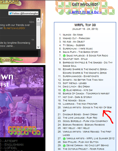 Hibernator Gigs Records compilation “Songs In The Key Of Bob” charted at #20 at WRFL last week!