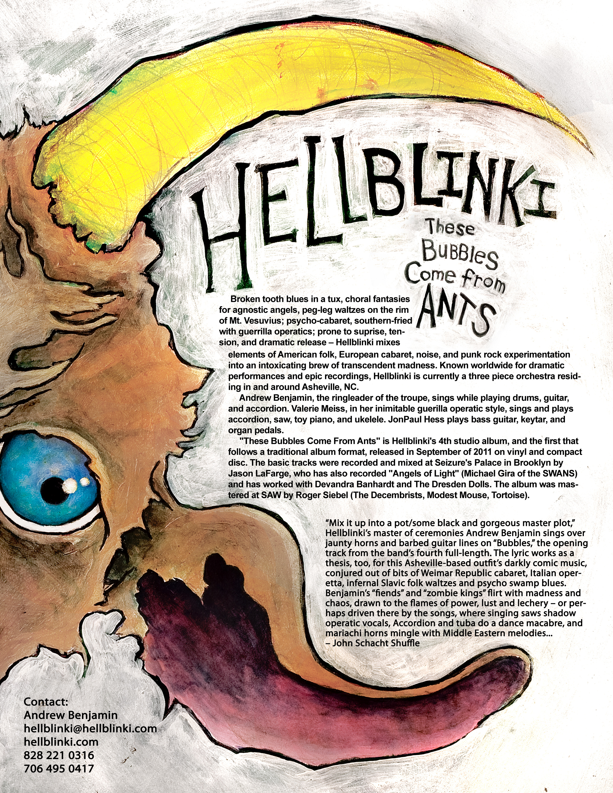 Currently, Andrew Benjamin is joined by Valerie Meiss on many instruments (accordion, melodica, glockenspiel, toy piano, ukelele, handsaw, various percussion, and an instrument she calls a cacaphonium, on occasion) plus one huge voice, her guerilla operatics interwoven beautifully with Andrew’s deep thrilling baritone. The two are backed up by JonPaul Hess on bass (electric or upright, depending on his whimsy), organ pedals, and keytar. Hellblinki recently released their 4th studio album, These Bubbles Come From Ants, and with it, they’ve come full circle; Jason LeFarge at Seizures Palace in Brooklyn, where much of the album was recorded and mixed (and which shares space with Martin Bisi’s storied BC Studio), was in the Atlanta band “Pineal Ventana”, who played Hellblinki’s first show. The band followed the full-length up with a 7″ single, All For You/I Am, which was recorded by Andrew Benjamin at The Hall of Justice in Candler, NC and mastered by Kitchen Mastering in Carrboro, NC.
