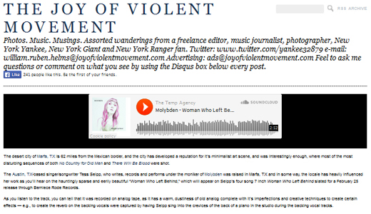 [Molybden] recorded a gorgeous, atmospheric album in a small house in Marfa, Texas called Songs From Lincoln. The songs are written with vibrancy and animated by ambient sounds like the clicking of train wheels or a reel of tape, and warm analog breaths. It is hard to explain, but you can hear something more — most likely it’s the spirit of creativity. – The Autumn Roses