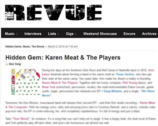 Thanks to Heartbreaking Bravery for including Karen Meat & the Players‘ “If I Were Yours” in this round-up of outstanding songs from 2015’s opening stretch.