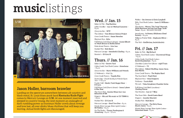 “St. Louis, 5-piece, punk-blues wrecking crew Kentucky Knife Fight” visits Stickyz. That’s the word from the band’s publicist, and let’s lean on the band’s publicist for more about Kentucky Knife Fight: “If there is a jukebox at the end of the universe, you will find Kentucky Knife Fight between The Stooges and Tom Waits. The electric Americana band specializes in telling stories about desperate people doing desperate things in places they shouldn’t be.” The opening acts are local bands Catskill Kids and post-rock, instrumental band Mainland Divide. There’s a $5 cover for the 18-and-up show with the music starting at 8:30 p.m.