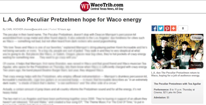 Waco Tribune interviews The Peculiar Pretzelmen in advance of their show at Cinema Lounge.